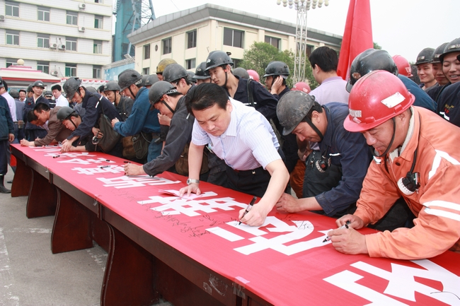 运行仪程上,率先进行了授安全旗仪式,由矿长刘岭向安全副矿长时圣国授安全旗,旗帜上写着今年“安全生产月”活动的主题“强化安全基础,推动安全发展”,寓意认真开展活动,确保安全生产。安全副矿长时圣国带领全体参会人员进行了安全宣誓,参人员举起右手,握紧拳头,庄严宣誓,确保实现安全生产。在启动仪式的最后,全体参会人员在安全生产月条幅上签名,保证安全生产。